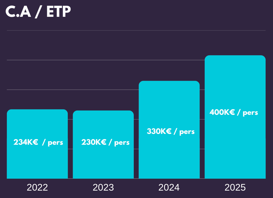 Le KPI qui me sert à mesurer l’efficience interne sur mes sociétés : je prend mon chiffre d’affaires et je le divise par le nombre de personnes à temps plein. (Si tu as plus de 30% de Freelance intègre les)